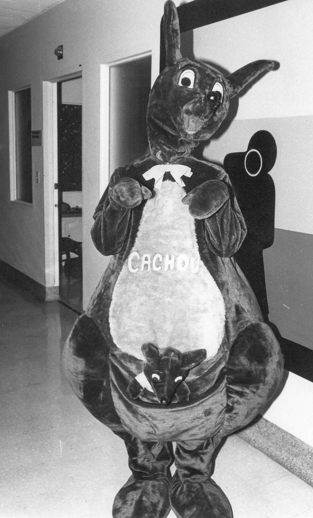 Cachou est né avant d’être prénommé. Dans les années 1980, l’Hôpital Sainte-Justine lance un appel à tous pour trouver un nom à sa mascotte marsupiale. Entretemps, Dr Gilles Bernard, obstétricien-gynécologue, discute avec Dre Anne-Claude Bernard-Bonnin, pédiatre, quand s’avance vers eux Dre Élisabeth Rousseau, également pédiatre, avec un sac de cachous à partager. Séduit par la sonorité du mot et la convivialité du moment, Dr Bernard y trouve l’occasion de nommer le kangourou « Cachou », à la suite de quoi Dre Rousseau soumet officiellement le prénom au registre des naissances de l’hôpital. C’est accepté : la fameuse mascotte sera prénommée Cachou et son nom de famille sera celui de toutes les familles.