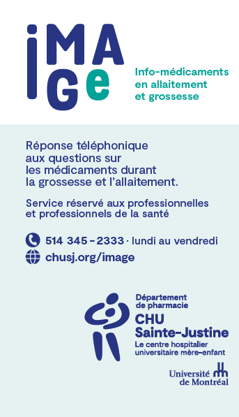 Le Centre IMAGe du CHU Sainte-Justine a débuté ses activités en 1997. Le Centre IMAGe est un centre d'information destiné aux professionnels de la santé et traitant de l'innocuité et des risques liés aux médicaments durant la grossesse et durant l'allaitement.