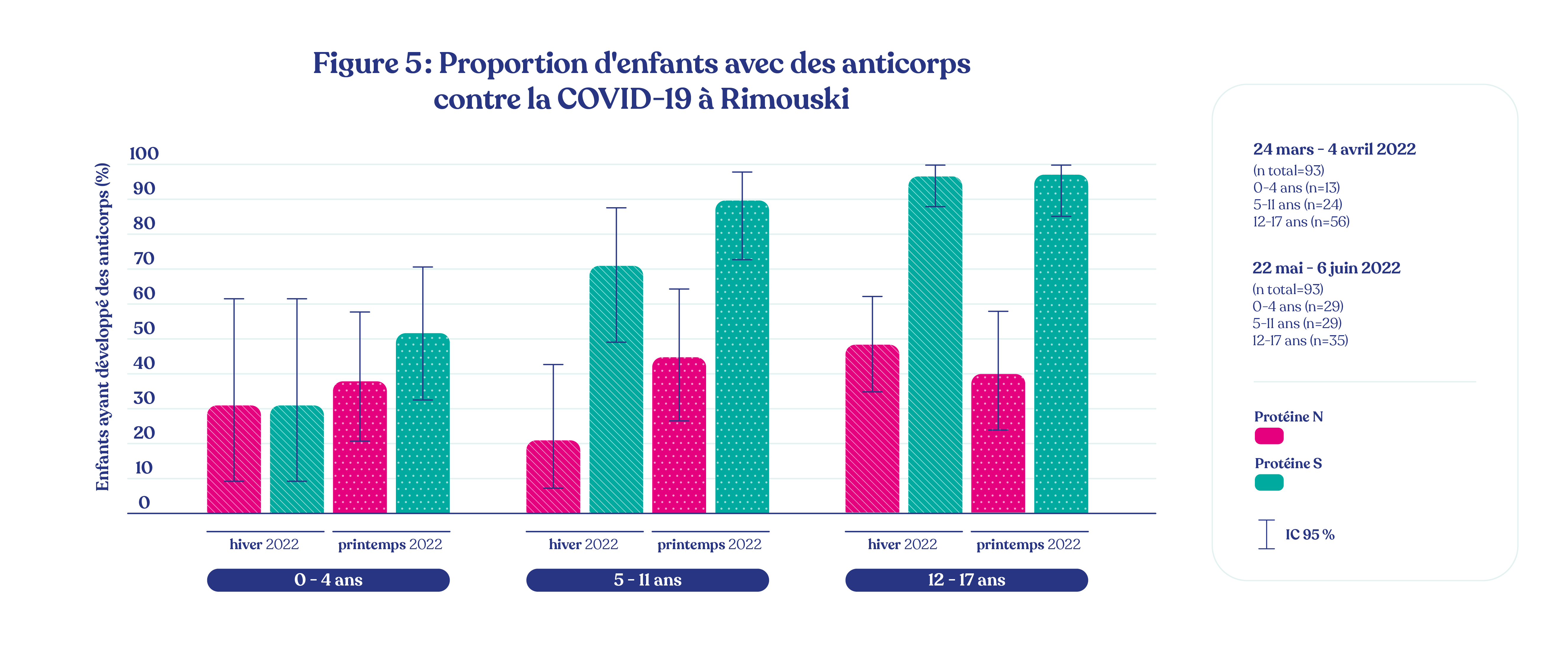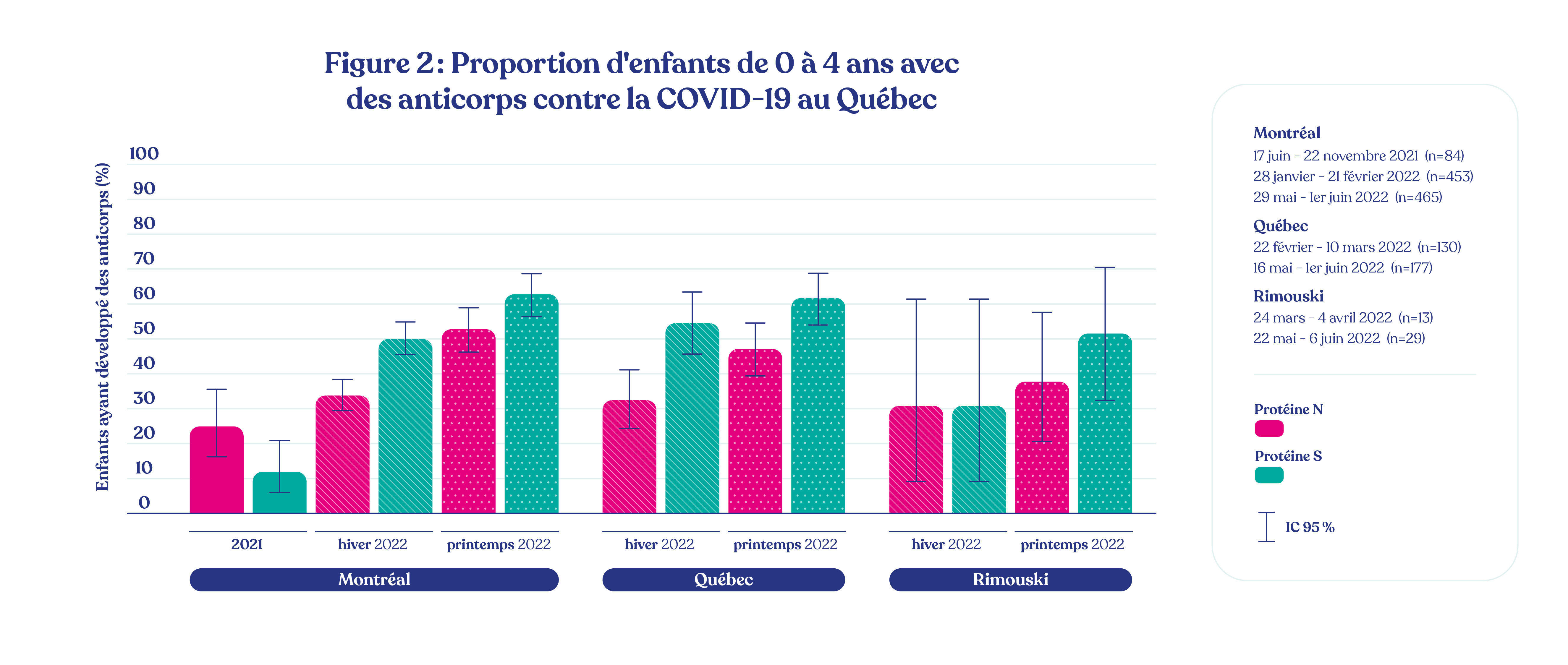 Ainsi, sur les 177 enfants de 0 à 4 ans pour lesquels un échantillon sanguin résiduel était disponible à la suite d’une visite à l’urgence du CHUL, 47% avaient des anticorps contre la protéine N et 62% contre la protéine S, alors que ces proportions s’élevaient à 32% et 55%, respectivement, en mars 2022. À Rimouski, 38% des 29 enfants de 0 à 4 ans avaient des anticorps contre la protéine N et 52% contre la protéine S. Comme ce groupe d’âge n’était pas encore vacciné, la présence de tout anticorps (N ou S) représente une infection naturelle.