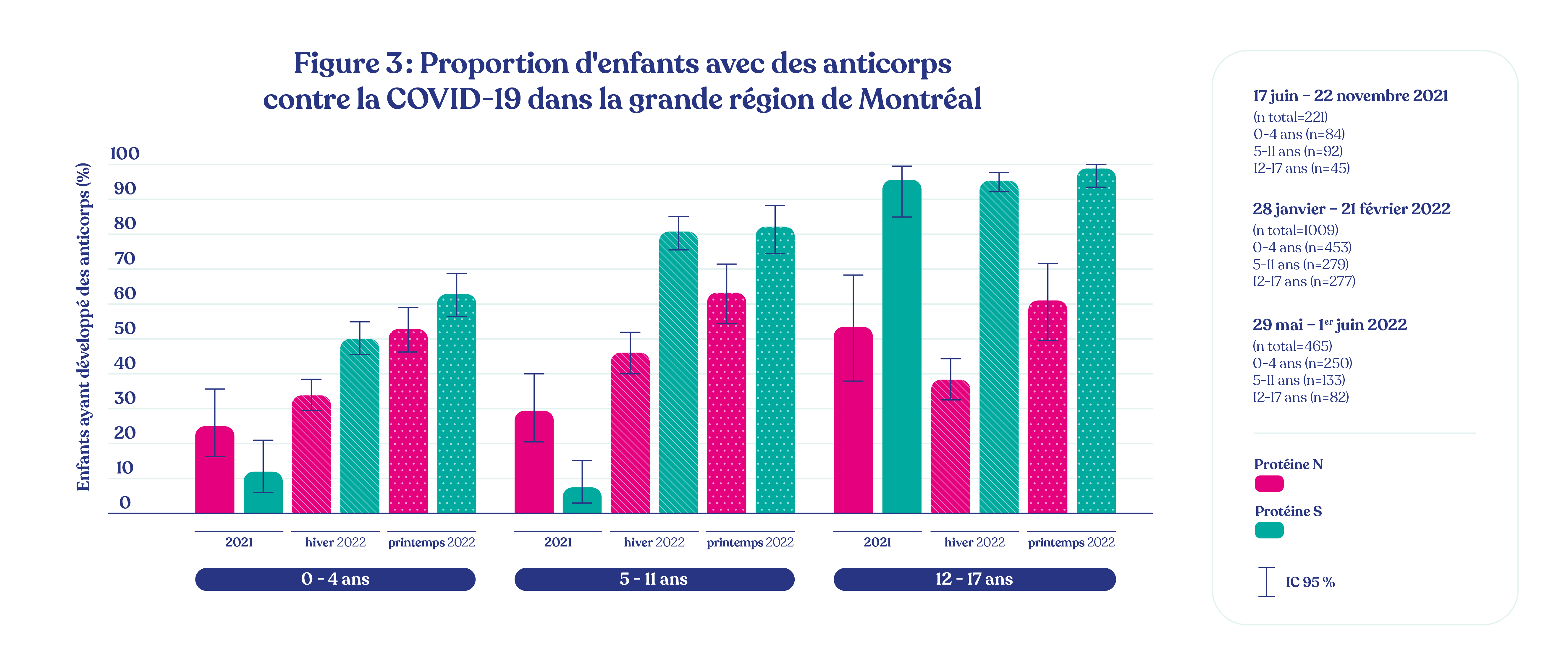 Chez les enfants des autres groupes d'âge, on note une augmentation des anticorps contre la protéine N, comparativement à la séance précédente. Au CHU Sainte-Justine, chez les 5 à 11 ans, le pourcentage s'élevait à 63%, soit une augmentation d'environ 17%. Chez les 12 à 17 ans, il atteignait plutôt 61%, soit une augmentation d’environ 22% (Fig. 3).