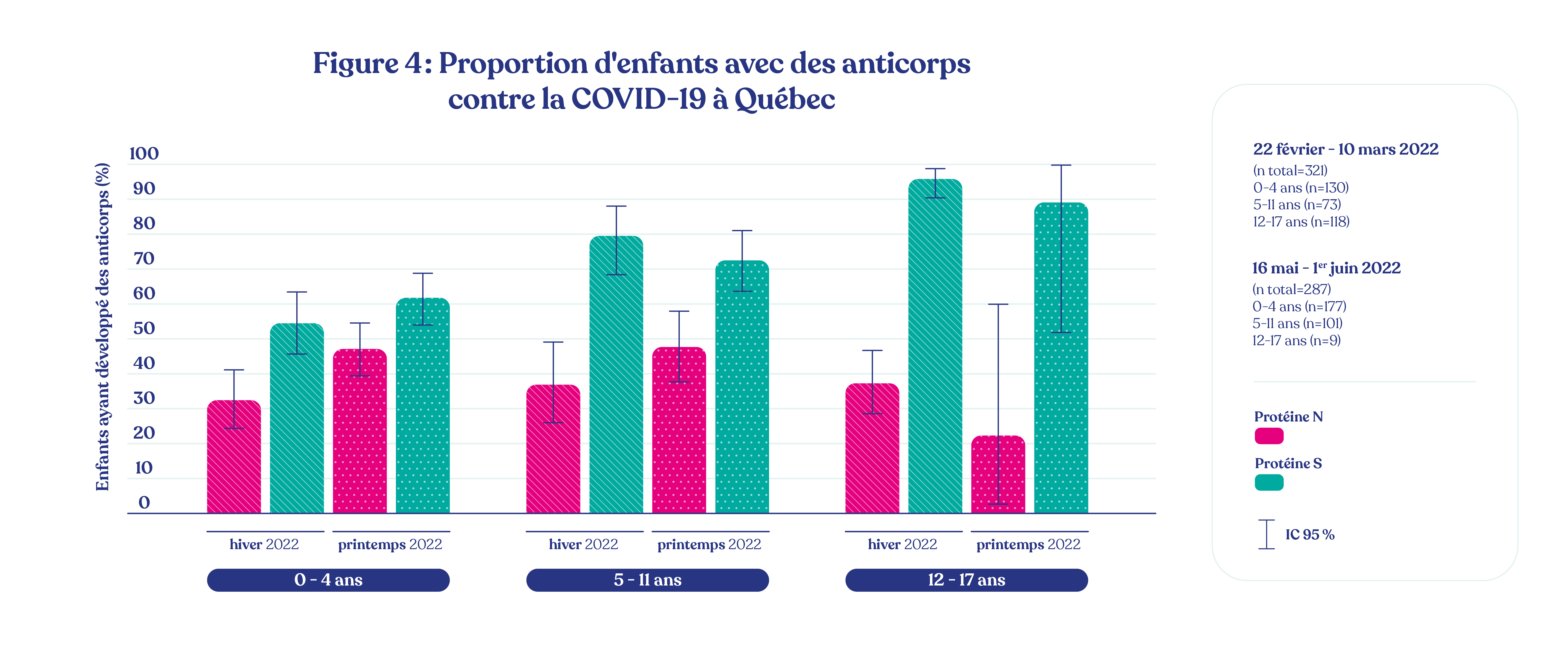 Au CHUL, des 101 enfants âgés de 5 à 11 ans, 48% avaient des anticorps contre la protéine N, une augmentation d’environ 10% (Fig. 4).