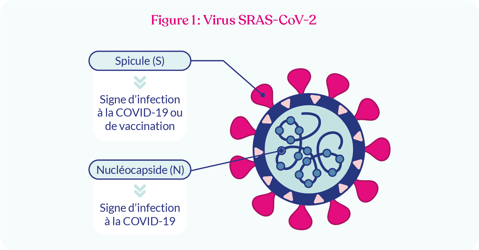 Une personne infectée par la COVID-19 développe deux types d’anticorps (IgG) : des anticorps contre la protéine de la nucléocapside (N) et d’autres contre la protéine de spicule (S). Toutefois, une personne vaccinée ne développe que des anticorps contre la protéine S (Fig. 1).