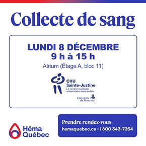 Le 8 décembre prochain, la collecte de sang d'Héma-Québec est de retour dans notre établissement.