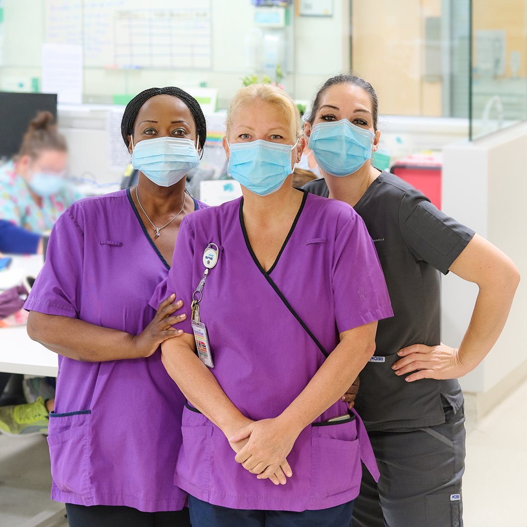 Voici Shirley, préposée aux bénéficiaires depuis 10 ans au CHU Sainte-Justine, et deux de ses recrues, Jeanine et Nathalie.