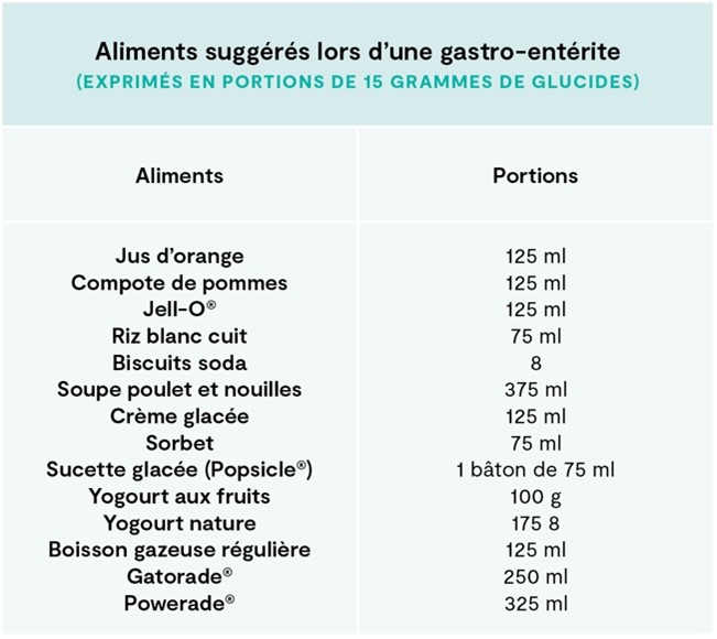 Si le jeune diabétique est très nauséeux, s’il vomit ou refuse de s’alimenter, il ne faut pas le forcer à manger. On remplace plutôt son régime par une diète légère ou on lui donne des liquides contenant les glucides nécessaires pour maintenir sa glycémie à un niveau adéquat.