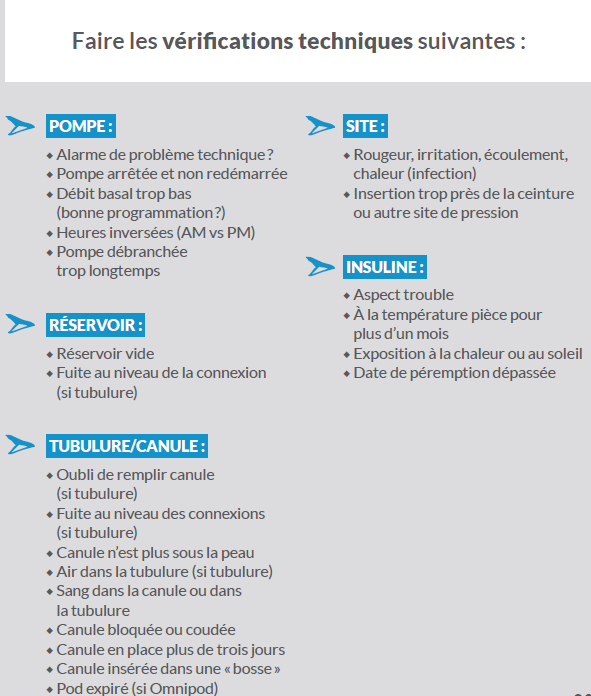 Si vous soupçonnez un problème technique en raison d’une hyperglycémie, vous devez vérifier certains éléments de la pompe et du dispositif de perfusion d’insuline. Voici la liste des éléments à vérifier.