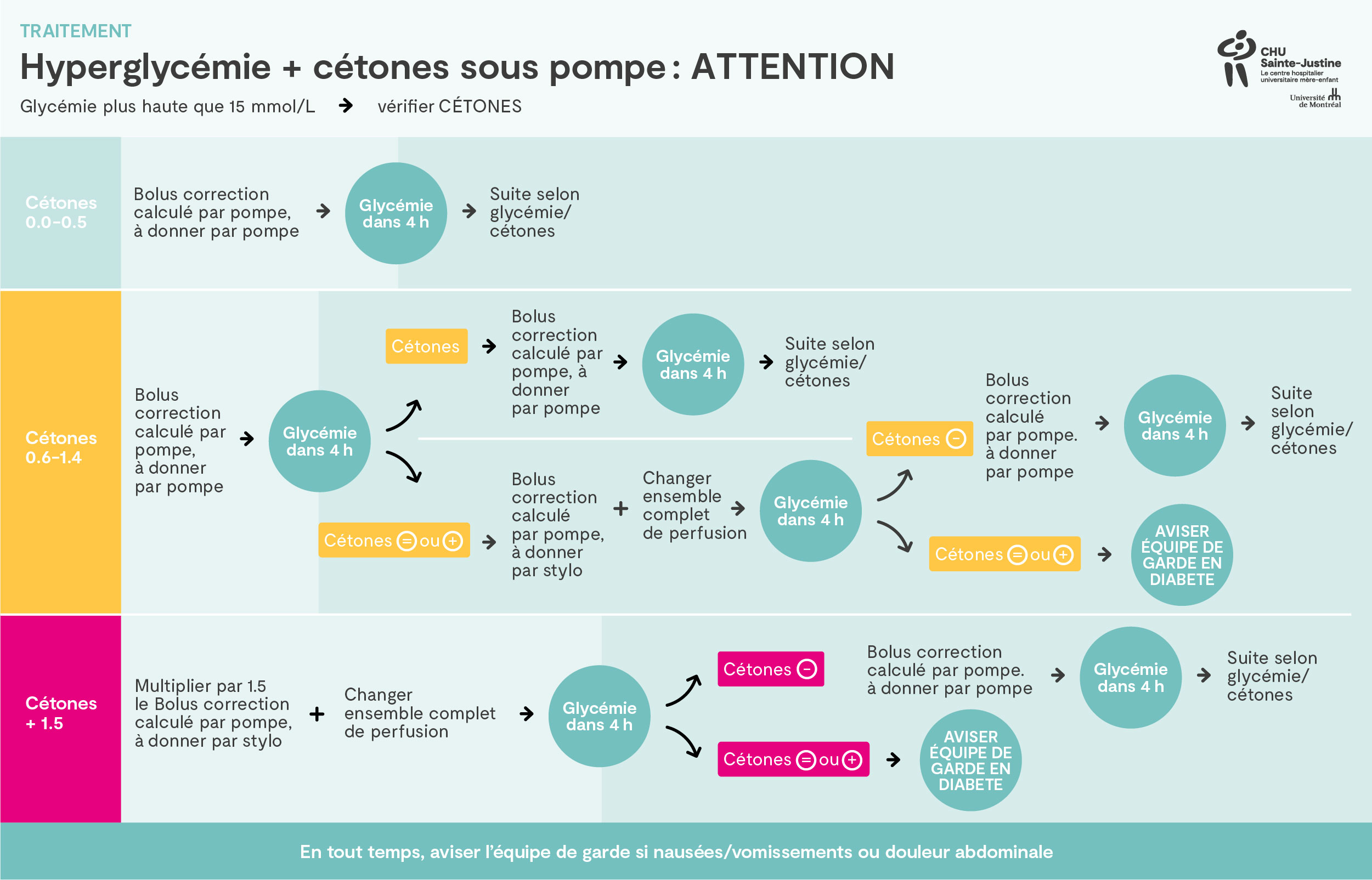 Si vous soupçonnez un mauvais fonctionnement de la pompe à insuline, il est important d’avoir une solution de remplacement. Cette solution nécessitera que vous connaissiez les derniers réglages de la pompe (à récupérer sur le site de téléchargement de la pompe), soit les débits de base, le ratio de glucides pour les repas et les collations et le(s) facteur(s) de sensibilité. Consultez l’algorithme Schéma de remplacement pour de plus amples renseignements.