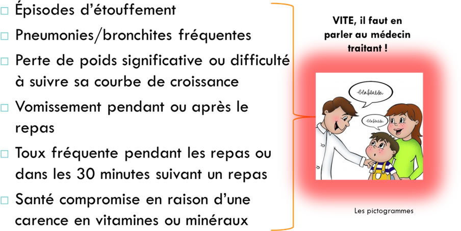 - Difficulté de déglutition ou à avaler, etc.