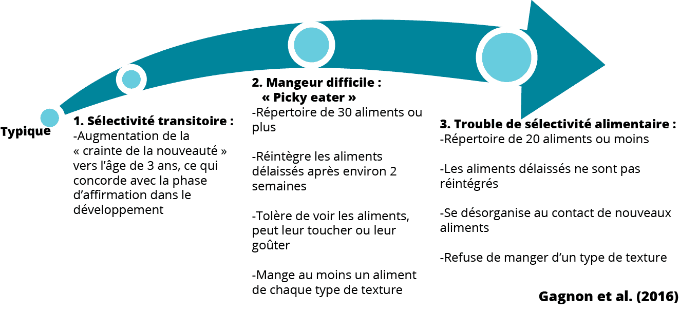- Typiquement : « tout allait relativement bien, mais depuis environ l’âge de 18 mois, il refuse des aliments avec certaines caractéristiques visuelles soit la couleur, la forme etc».